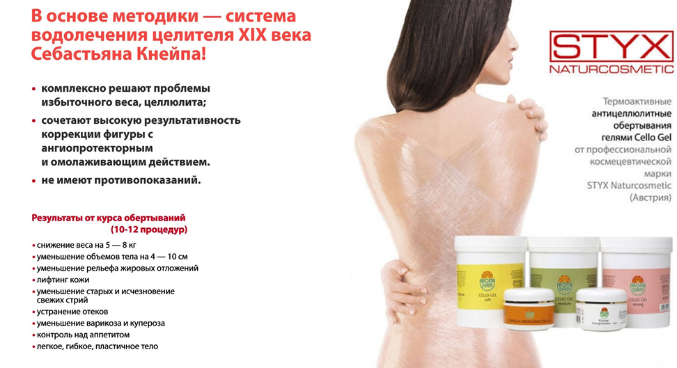 - Большой популярностью пользуются антицеллюлитные обертывания с гелями Cello Gel от ТМ STYX. Коррекция фигуры происходит буквально на глазах. В основу гелей Cello Gel от ТМ STYX входят ароматические углеводороды в большой концентрации, оказывающие термоцеллюлярный, ангиотонический и липолитический эффект на организм. В результате, выводятся шлаки и вы чувствуете себя абсолютно обновлёнными.